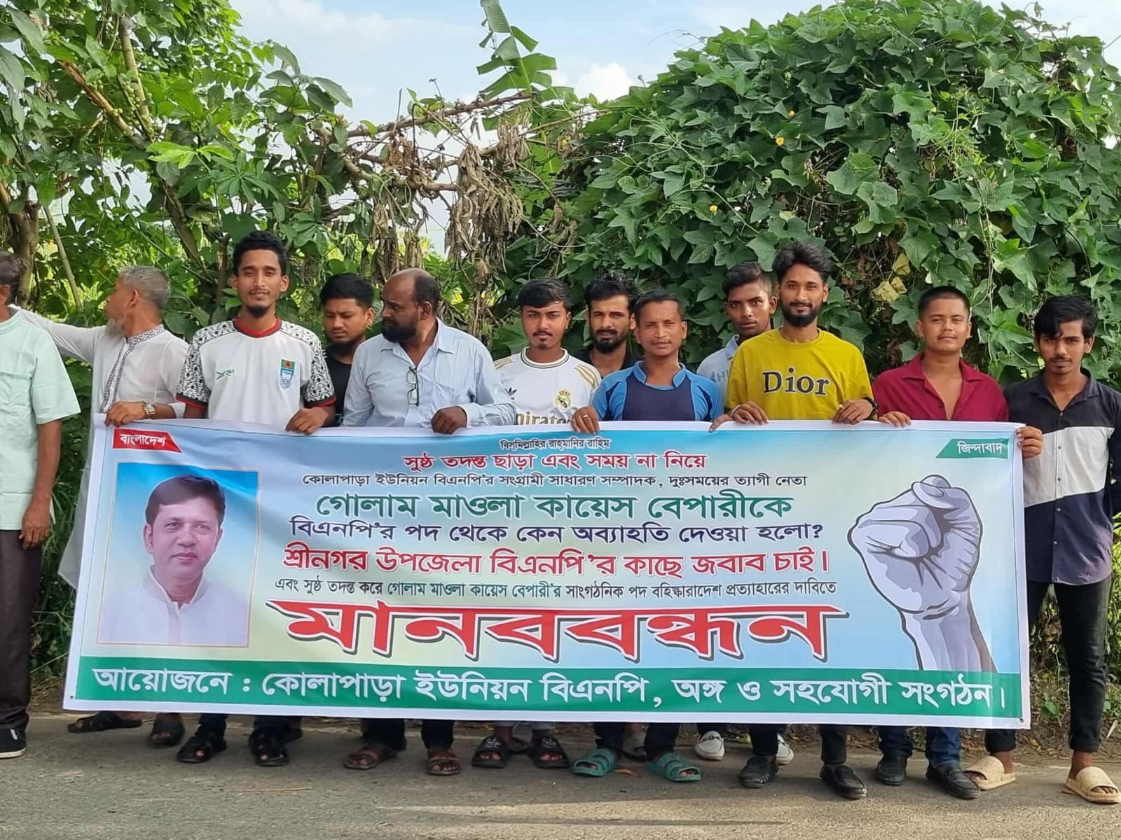 মুন্সিগঞ্জ জেলার শ্রীনগর উপজেলার কোলাপাড়া ইউনিয়ন বিএনপি‘র সাধারণ সম্পাদক গোলাম মাওলা কায়েশ ব্যাপারীকেদল থেকে বহিষ্কার করায় মানববন্ধন করেছে ওই ইউনিয়নের বিএনপি ও অঙ্গ সংগঠনের নেতাকর্মীরা। শুক্রবার বিকেলে শ্রীনগর বাইপাস সড়কের পাশে এ মানববন্ধন কর্মসূচি পালিত হয়। মানববন্ধনে অংশগ্রহণকারী নেতাকর্মীরা জানায়, কোলাপাড়া ইউনিয়ন বিএনপির সাধারণ সম্পাদক গোলাম মাওলা কায়েস বেপারী একজন দক্ষ ও পরিশ্রমী নেতা।কর্মীবান্ধব সফল এই নেতা নেতৃত্বে বিগত দিনে আন্দোলন সংগ্রামে মাঠে নেমেছিল বিএনপি নেতা কর্মীরা। দলীয় নির্দেশঅনুযায়ী প্রতিটি কর্মসূচি সফল ভাবে তিনি পালন করছেন। অতএব সুষ্ঠু তদন্ত করে গোলাম মাওলা কায়েস ব্যাপারীর বিরুদ্ধেআনীত বহিষ্কারাদেশ প্রত্যাহারের দাবি জানান তারা।